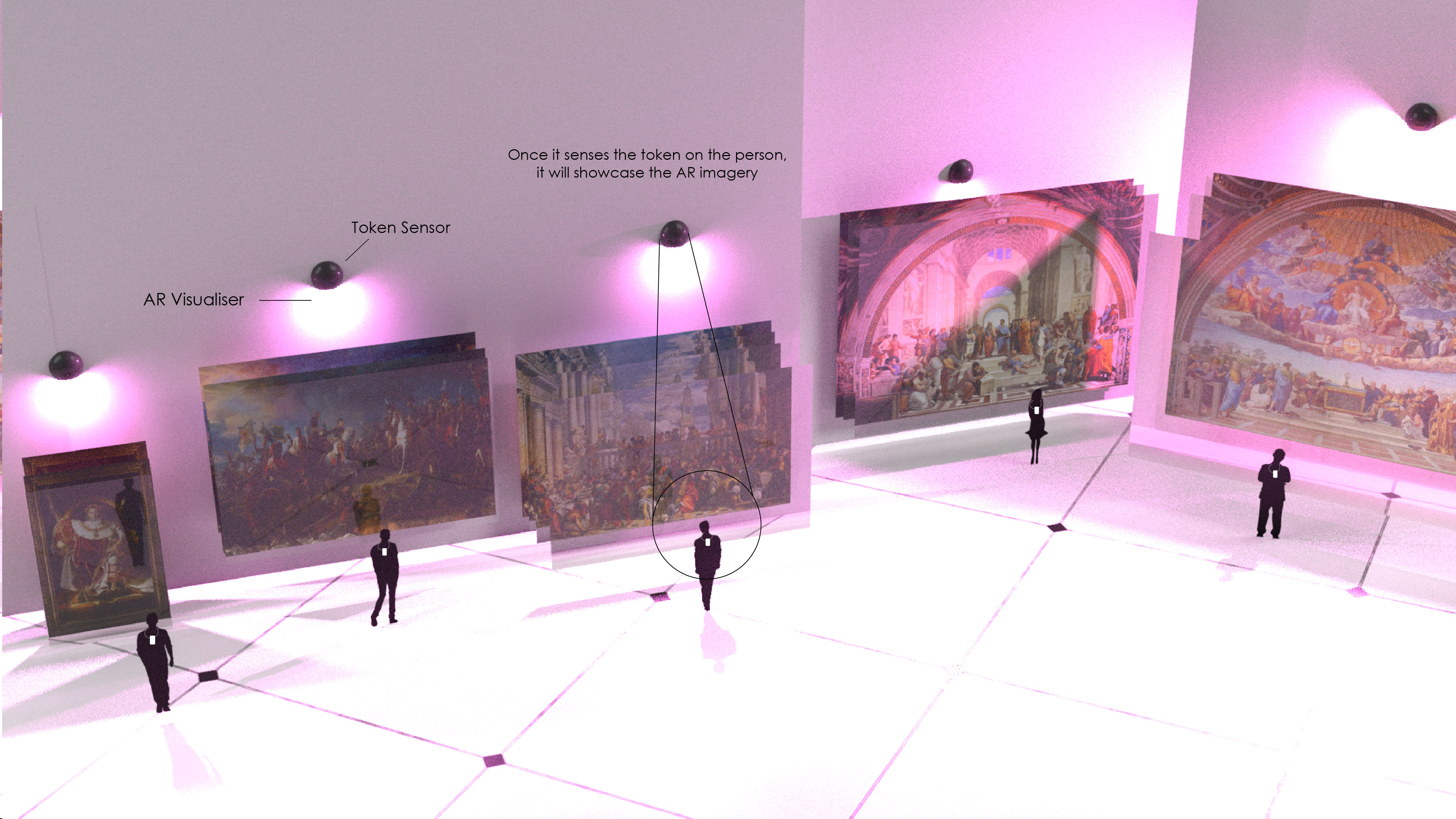 The trinket would communicate with the sensors in the space and activate the AR effects when the user approaches a painting. This way, the user would not need to take out their phone or scan any QR code, but simply enjoy the AR experience as part of the exhibition.