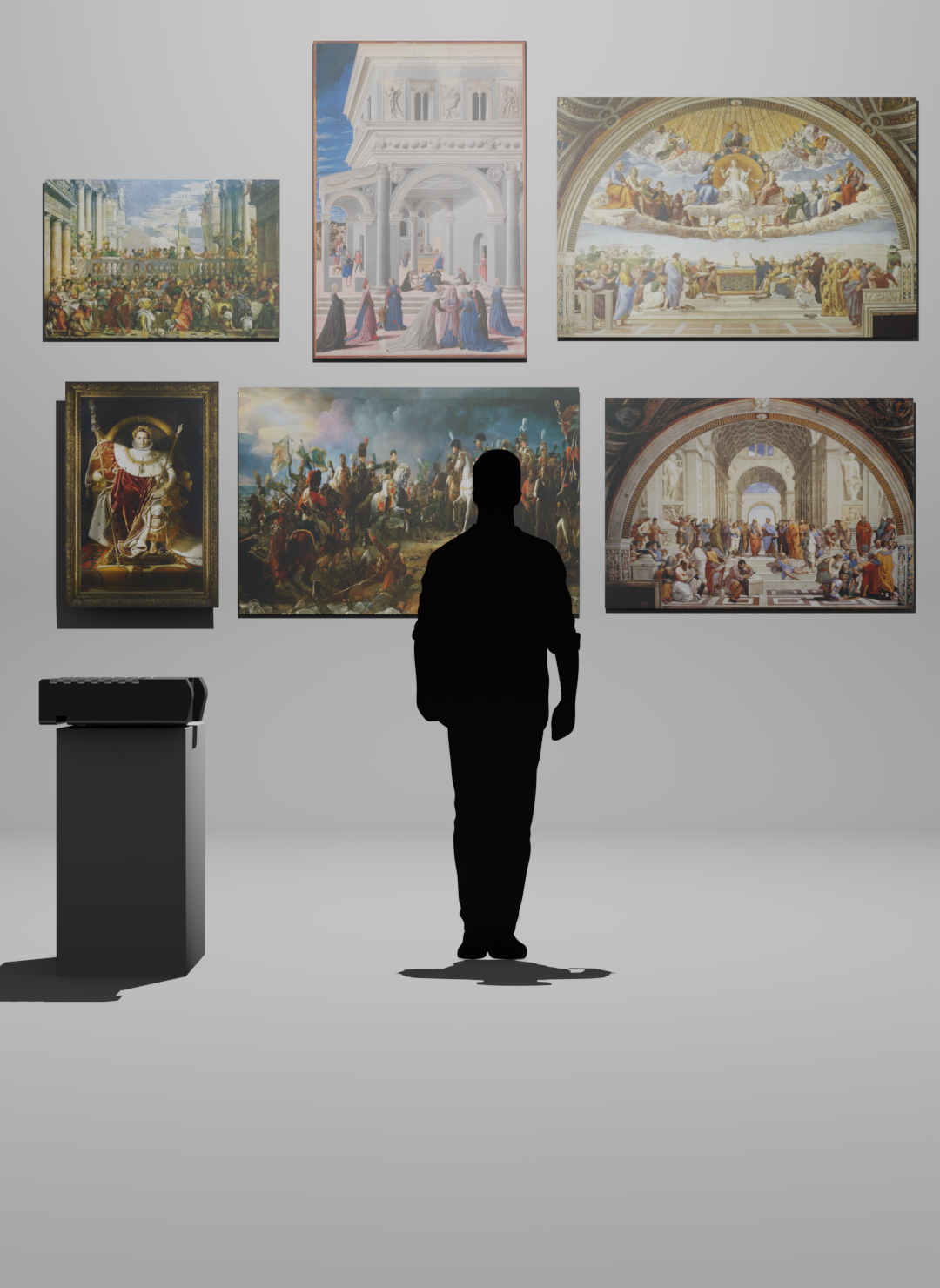 For prototyping, I wanted to have a proper space in which the user stands in front of a painting and the AR experience begins. Now for most cases, when searching for AR experiences I always see user looking through the phone or screen to see the effects. But I wonder, there are so many experiences in which visitors will want to just walk up to the painting and just see the works.